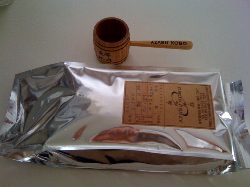 I asked the man behind the counter to choose something for me -whatever he recommended – and he gave me an “Azabu Blend” which was supposed to be a medium-roast coffee. It took twenty minutes to roast, so I went off to have lunch and came back. When I returned, he was waiting for me with a silver package of whole beans and a special gift – a Kobo coffee scoop. It was “for service” as the Japanese say when they give away little gifts with purchases.