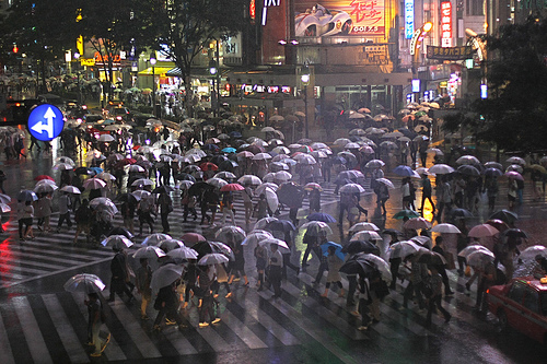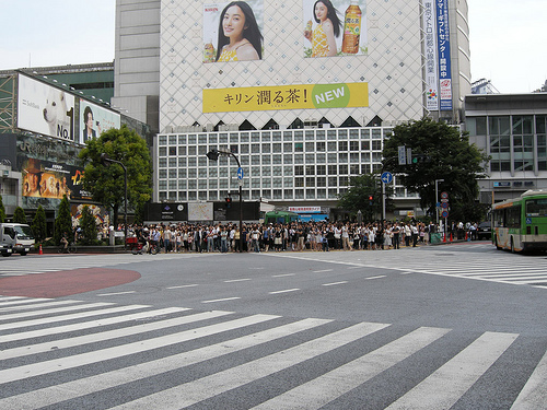 enormous daily flow of people from side to side. A common pass-time for workers and visitors alike is to sit at the 4th floor Starbucks that overlooks the crossing and watch the people go by. Many a photo has been taken from there! In fact, the crossing, along with the Starbucks, had a role in the film “Lost in Translation” as it functions as a metaphor for the main character feeling lost in the trenches and culture shock of Japanese society.
