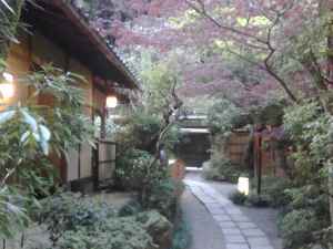 The entry to Ikai Toriyama (the restaurant) Nearby, the fancy restaurant called Ukai Toriyama for dinner with bridges over brooks, sitting on tatami mats, waitresses in kimonos