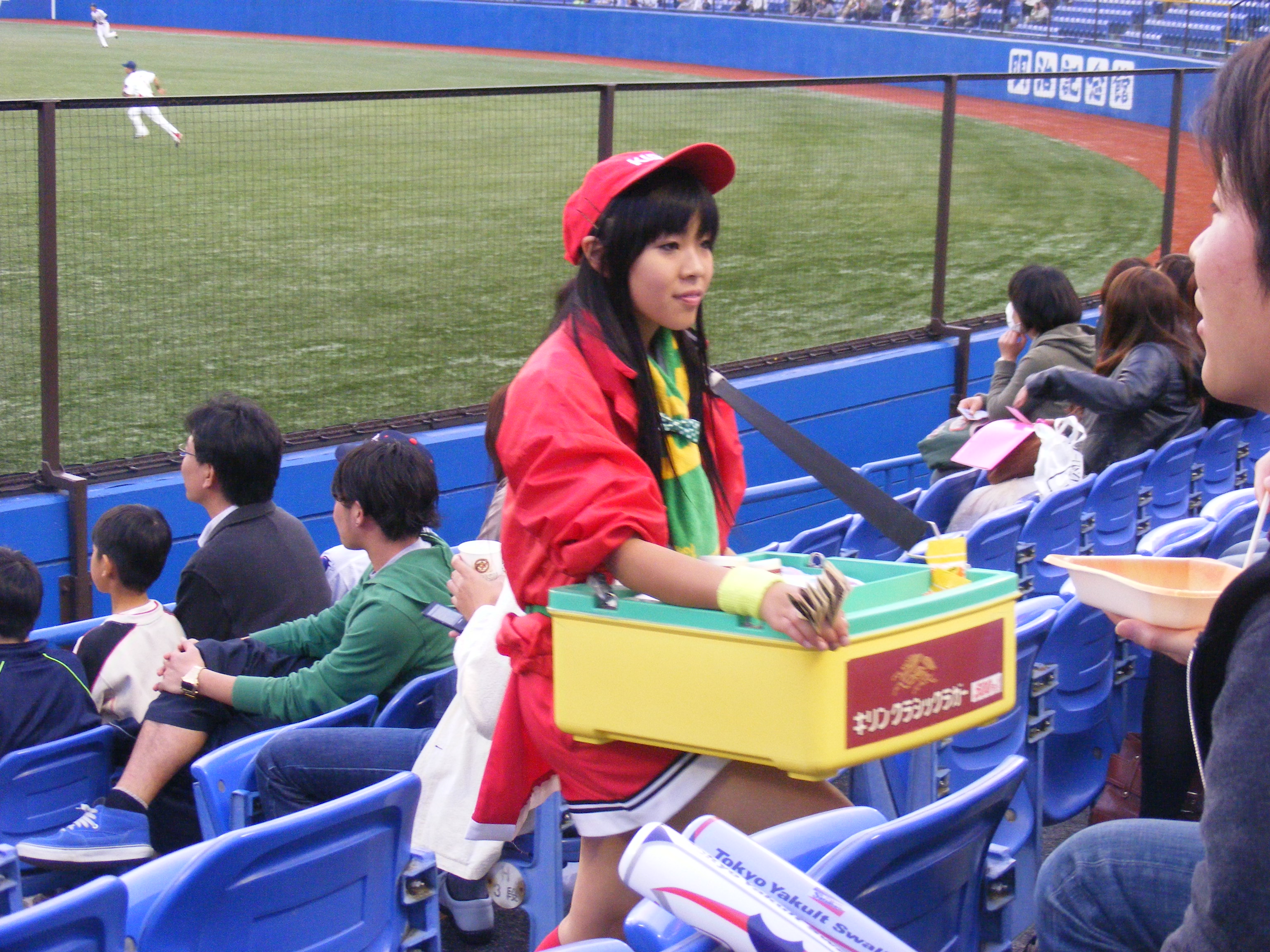 I love the way the beer works at the stadium. It’s all separated by brand. There are a few types of beer that have the hawkers with bottles or cans. But most of the vendors – most often young girls – walk around the stadium dressed in cutesy little uniforms with kegs strapped to their backs. Highly efficient! Less waste!