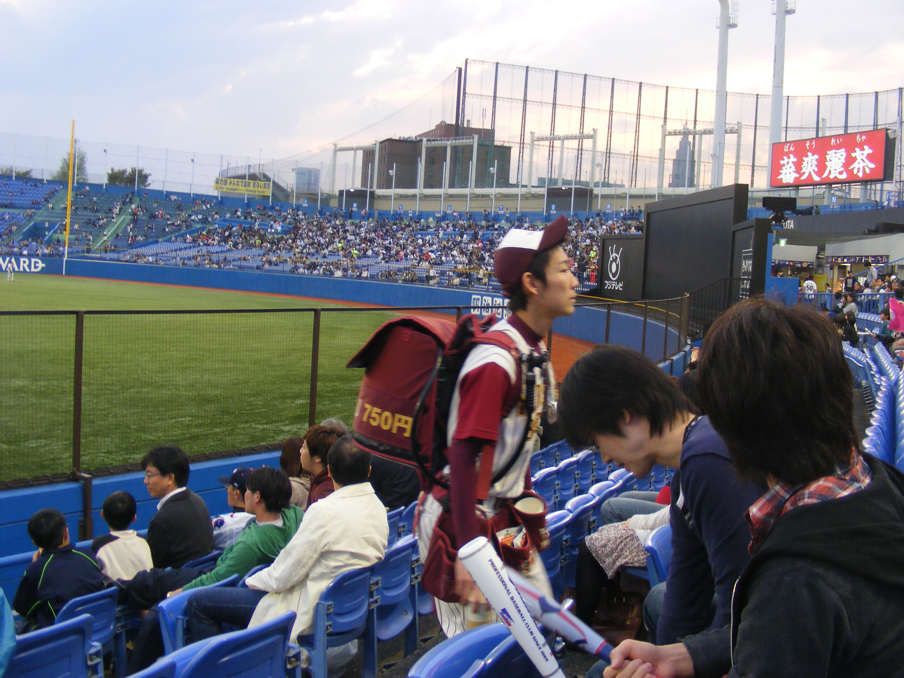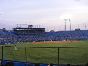 Last week, a whole group of friends went to see the Yakult Swallows play against the Yokohama Baystars. We have been Swallows fans since moving to Tokyo for no particular reason other than the fact that they play their games not far from our house and they’re always the underdog – we love rooting for the underdog. Yakult, I have to mention, is a drink company in Japan. Corporations are allowed to sponsor teams – as evidenced by the likes of the Yomiuri Giants – a media company, or the Softbank Hawks – a cellphone company. There aren’t monopolies in the cities either – the teams are all clustered in big cities like Tokyo, Yokohama, Fukuoka or Osaka.