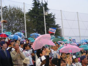 Cheering is in a category of its own with Japanese baseball. There is no private, individual shouting. All cheers are group cheers. There are proscribed cheers for each player as he comes up to bat. There are cheers for the homeruns, cheers for the hits, and even cheers for the outs. When a player rounds home plate, and successfully scores, everyone in the stands raises a mini umbrella (which has nothing to do with the weather!) and moves it up and down, side to side in unison while singing. It is quite a sight! The whole thing personifies the Japanese emphasis on the collective rather than the individual.