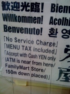 This sign implies that the shop really wants customers to spend money and they will help them do it in any way possible. The directions to the nearest ATM are sketchy at best, but they’re there. The sign means that the ATM is near here; it’s about 150 meters down the road.
