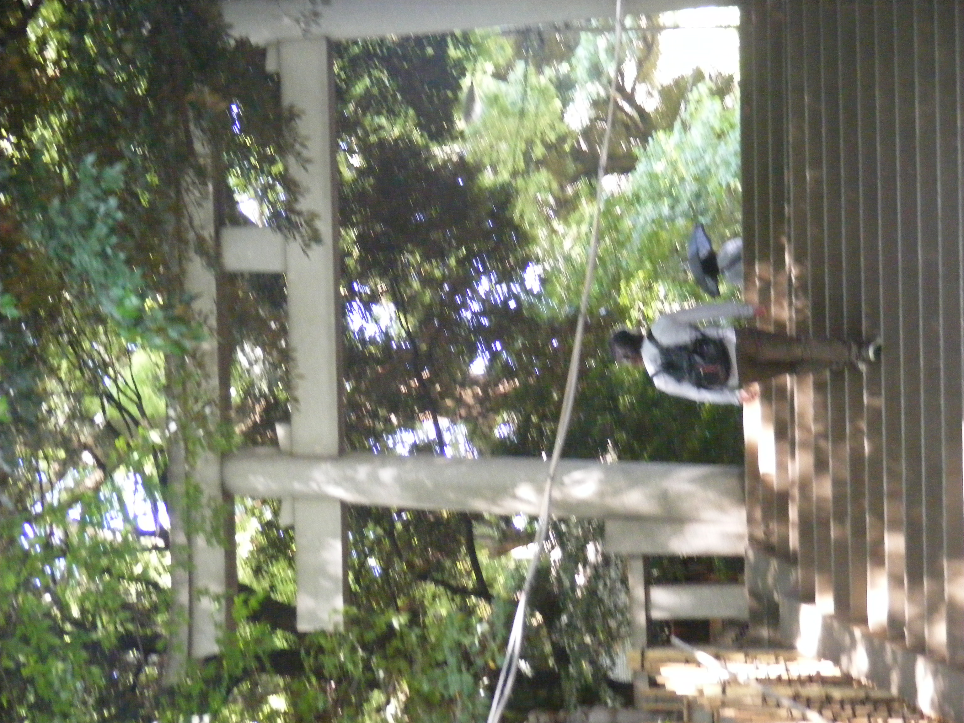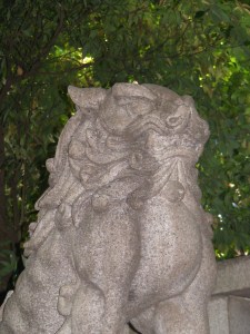 different world. Trees buttressed each other to create a cover of green. It was a lovely shrine made of up of three small buildings and several interesting statues, including large lions at the sides. The ground below our feet was fine dirt, not concrete at all. We could walk down a long set of steps to the bottom part of the shrine, which included a sumo ring. We’re not sure what or who practices sumo there, but it is clearly unmistakable as a sumo ring. Right at the bottom of a tree-lined shrine.