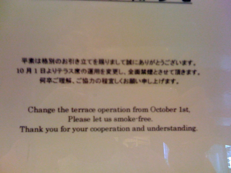At Starbucks, patrons can smoke for free, even on the terrace. That’s what this sign says anyway. Smokers will soon flock to this Starbucks in Shinjuku in order to smoke as much as they would like, all for no cost. No I’m joking. I think they forgot the verb in the sentence. They meant, “please let us BE smoke-free.” People who go there for the free smoking will be sorely disappointed.