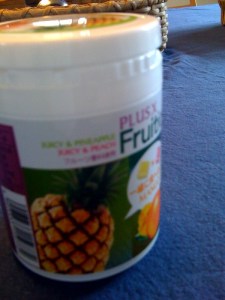 On this first side of the bottle, it suggests you try the pineapple flavored pieces. On the other side of the bottle, it suggests trying a