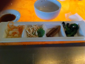 Today is a holiday in Japan – it’s A Former Emperor’s Birthday (current Emperor’s birthday is December 23rd) – so Marc and I decided to go out to lunch. (The kids were in school and Marc’s birthday is tomorrow, so it seemed like good timing!) We went to a great restaurant in Roppongi Hills called the Hong Kong Kitchen, where they serve Chinese Dim Sum all day. I really wanted to show you the appetizer that comes with the lunch set menu, which in my mind, Japan-ifies the Chinese food. All of the items were served cold.