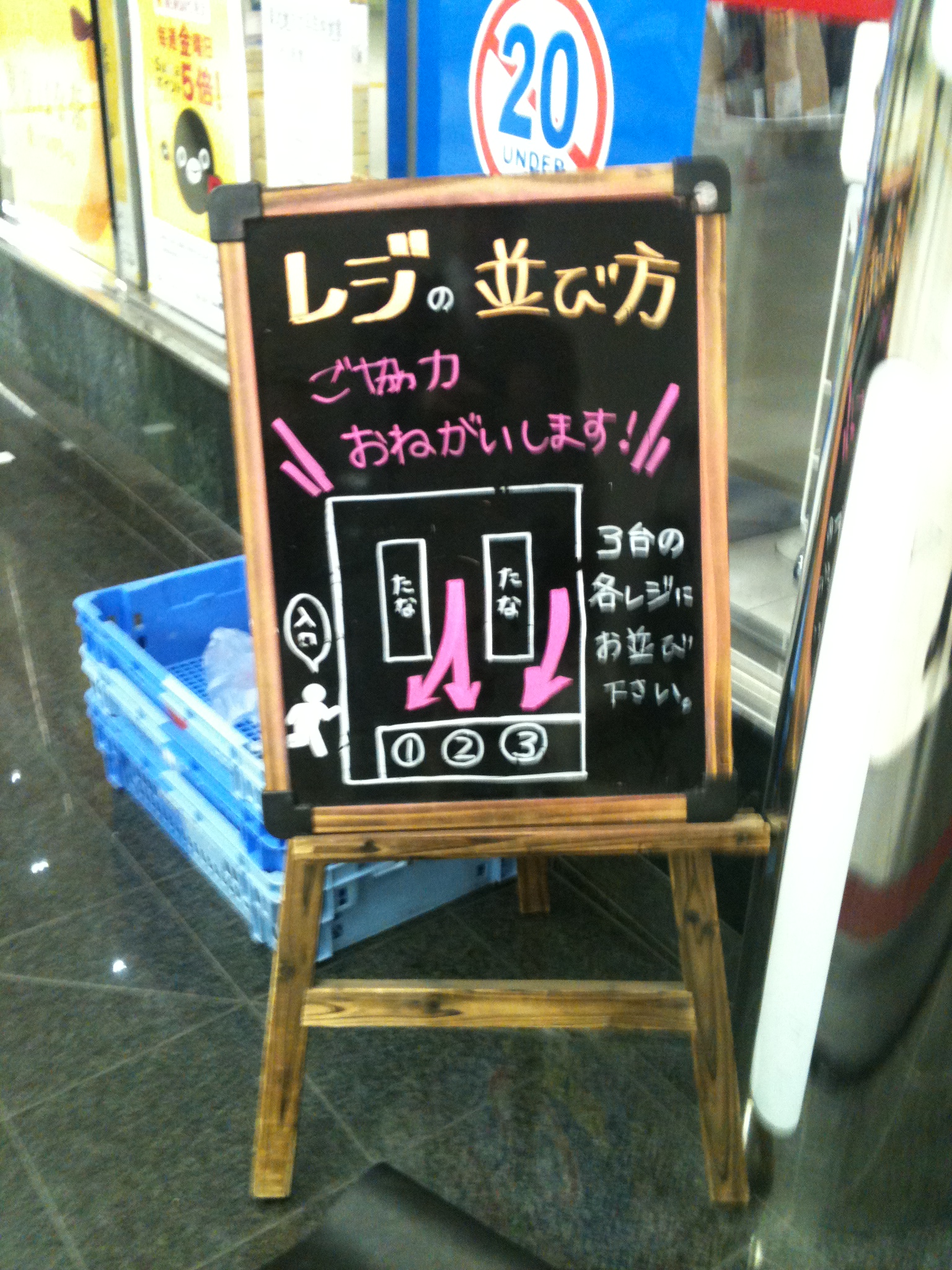 In this carefully drawn illustration, the store would like customers to know the proper way to line up in order to pay for their purchases. Please be mindful to enter the line from the proper direction, and please queue around the aisles just so. I have no doubt that the Japanese consumers studied the sign as they happened upon it on their way to the checkout lines. I am positive that no one went the wrong way or bucked the system. Especially when the rules are outlined so clearly, no one would dare to ignore them. It’s just part of the Japanese ethos. It’s a part I greatly admire. Enjoy!