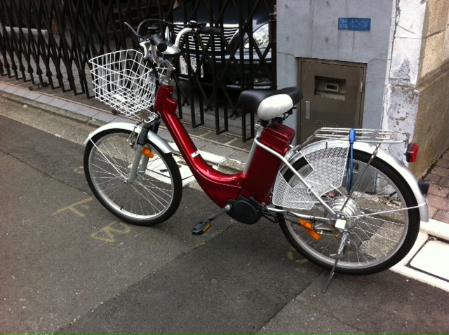 Here’s a picture of me on my bike. And then here’s a photo of the bike itself. It’s big. It’s really heavy with that huge battery in the back, so it’s also a bit unwieldy. But it is really neat to be a cyclist in the city, I’ve found. I like finding my new routes to take with the bike and I feel like I garner respect when riding it. Just last week a group of American tourists in the city approached me when I was stopped at a traffic light in Hiroo. They had a map and were slightly lost; I helped them, and as they were saying goodbye, one guy said, “Hey, is that a battery at the back of your bike?” I laughed and nodded. They were so enthralled that they took a picture of it. These things are not common in the States – I knew that, but I guess I forgot.