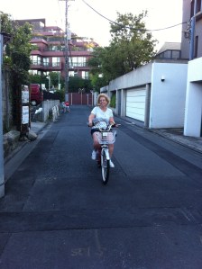 of streets, pedestrians, cars and cyclists that populate the city. However, figuring things out and the actual “doing” are quite different. I know I need to keep to the left on the street, but when I wobble a bit, keeping to the left and not rolling off the sidewalk are quite different things. The pedestrians in Tokyo are just terrible. They’re slow, and they weave on the street. Their path is impossible to predict, so several times I’ve thought someone would move right and at the last second he swerved left and I had to quickly correct my course. Also, they are completely oblivious. They don’t look around them or listen. Sometimes they’re just staring into space and not paying attention to anything so they walk out right in front of my bike. I’ve already had to stop short more than once to avoid a pedestrian. Even when they’re walking toward me, they’ll stare at me for long moments and sometimes they force me to stop because they’re walking five abreast taking up the sidewalk. Where do they think I’m going to go? It’s maddening.