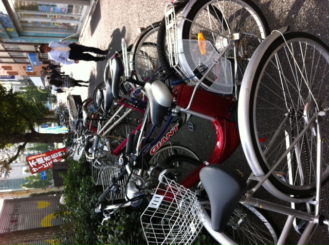 This is only a tiny example of a huge phenomenon in Tokyo – bicycle parking. People just leave their bikes wherever, locked or unlocked, and they sit for however long completely untouched. My bike is the second one in in the photo. I parked the bike and stepped back to take the photo. Before I could get my camera fully ready, someone slid in between me and my bike and parked his quickly. He walked away in a quick second, not bothering to lock his bike. This site is in front of Temple University, where I teach two afternoons a week. There is a line of bikes that extends down the block, stops for an intervening street, and then continues down the next block. People are generally polite and don’t park their bikes perpendicularly if the sidewalk is narrow, but this sidewalk is unusually wide for Tokyo, so that’s how they fit in the most bikes. Scads of bikes as far as the eye can see…