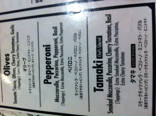Sources close to the writer (a very pizza-knowledgeable 12-year-old who I adore, but is not my child) insist that the best pizza in the city is at Pizza Strada in Azabu Juban. He might very well be right. The crust is thin and alternately soft and crunchy in the right spots. The sauce has a touch of sweetness but not overly so. The best part is the place itself. It has a beautiful terrace and inside the atmosphere is cozy and warm. The pizza chef makes each pizza to order and apparently loves to chat as he shifts the yummy goodness in and out of the stone pizza ovens. There are only four pizzas on the menu and the ingredients in them are very specific. If you want cheese on the marinara pizza, it’s 500 yen extra. If you want sauce on the Tamaki or pepperoni, it’s 500 yen extra. Like most menu items in Japan, there are no substitutions. The way it’s written is the way it comes, and asking for it otherwise is generally quite an ordeal. In fact, the night I went with my favorite pizza-buff, I ordered the Tamaki pizza, which is an interesting mix of smoked mozzarella, peccorino cheese and cherry tomatoes. As I mentioned, it does not come with sauce. When I asked to add sauce, the waitress went to ask the pizza chef if that was possible. I felt terrible, as if I was insulting the chef. But the waitress came back and replied in the affirmative that it would be