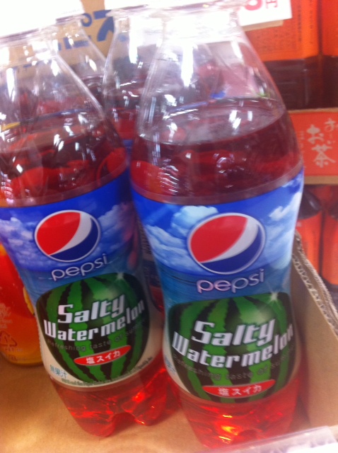Every summer, Pepsi comes out with a new flavor in Japan. This summer it was, as you can see here, salty watermelon flavor. It’s a limited engagement type of thing – it only lasts from late June through August, and then it is gone from the shelves. A follower of mine on Twitter, @TheTokyoFiles, (See his blog at The Tokyo Files) tells me that it tasted like mild pickle juice. I am not sure that’s such a ringing endorsement, but it is descriptive. Most often these summer sodas have less carbonation than other sodas in order to enhance the flavor. I’m sure it was an interesting, if not fully enjoyable, experience. I can’t wait til next year to see what the Pepsi company will come out with next!