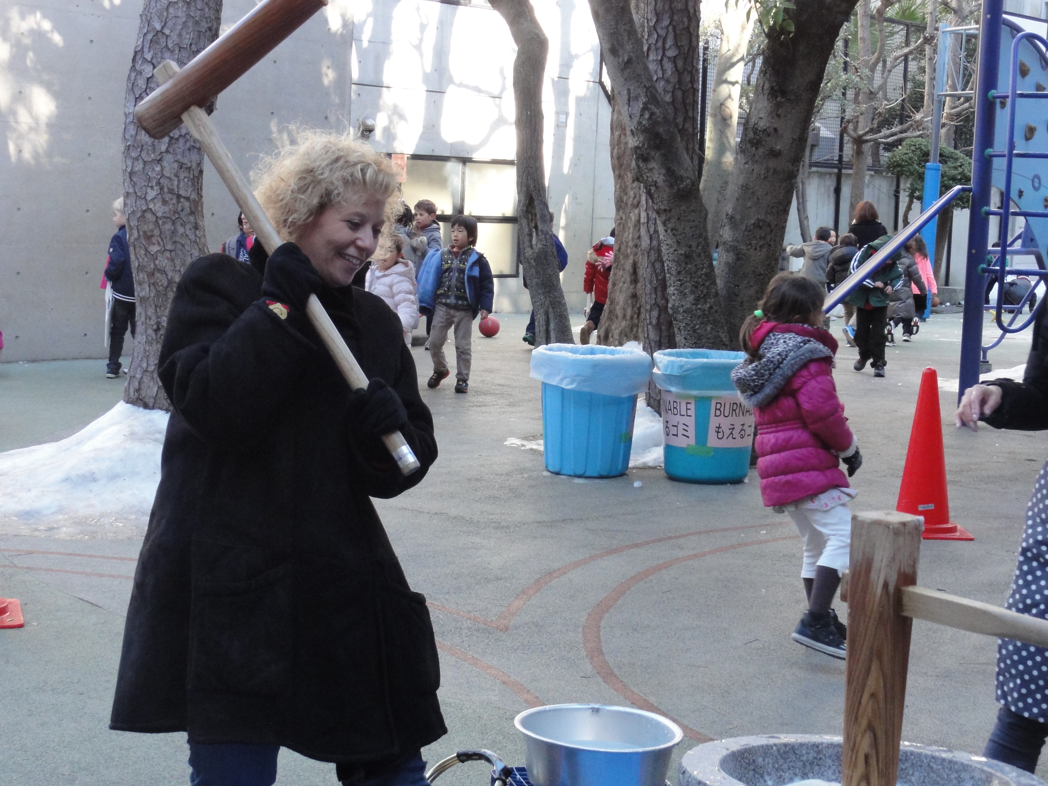 In past years my family has participated in rice pounding – omochitsuki – at our kids’ school. It’s a tradition at the first of the year for the Japanese to take special mallets and pound the cooked rice so that it becomes a glutinous mass and can be formed into yummy balls that people roll through such treats as soy sauce and seaweed, azuki bean paste or sesame powder, and then eat. In prior years, my job has been to watch the kids and adults pounding and shout “Yoisho!” along with them – meaning something akin to a Jewish “Oy!” My husband was always the adult pounding representative from our family – I had never even taken up the mallet! This year, however, was quite different.
