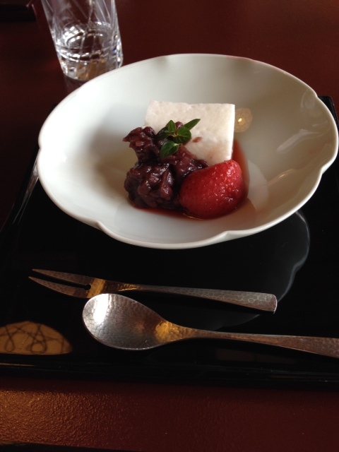 and texture. The fried tofu had a satisfying crunch, while still being smooth. The sashimi and other prepared fish exploded in a bloom of freshness. Everything was presented with grace and beauty, from the pouring of the sake, to the dishing out of the soy milk with two perfect pieces of tofu floating in it. The mixture of seasonal: tastes, sweet and savory, salty and fruity, all combined to make an exquisite dining experience.