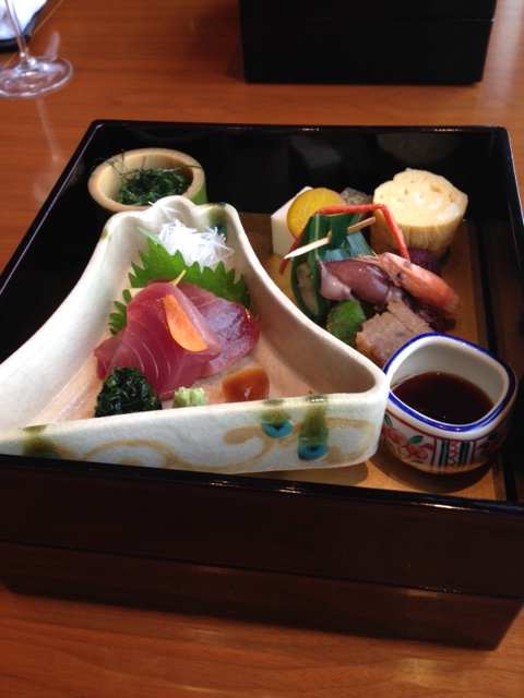 If the view wasn’t enough, the food was exquisite. Served by beautiful young women in stunning kimono, the black lacquer bento box practically told a story in its intricate design and contents. The first course was a bit of egg tofu in a soy milk sauce, and a clear miso soup with a dumpling made of flounder, along with a taste of burdock and ginger in it. And then came the big, two-story box. On the top there was katzuo (bonito) sashimi, and other small delicacies including a tiny squid, a shrimp head, a bit of egg rolled with cheese and a miniscule mound of sauteed spinach. The bottom layer held some grilled mackerel, simmered vegetables and two small dumplings of shrimp and corn. We paired it with a decadent glass of